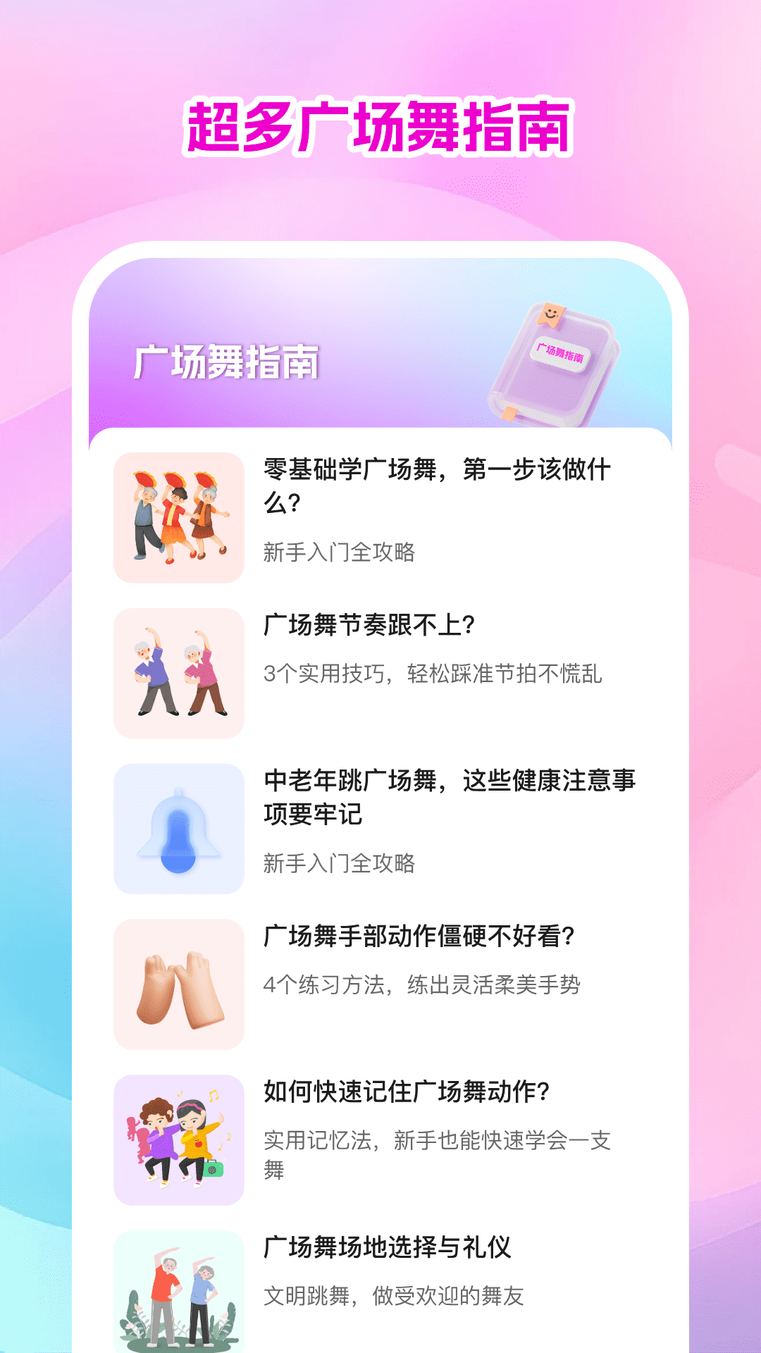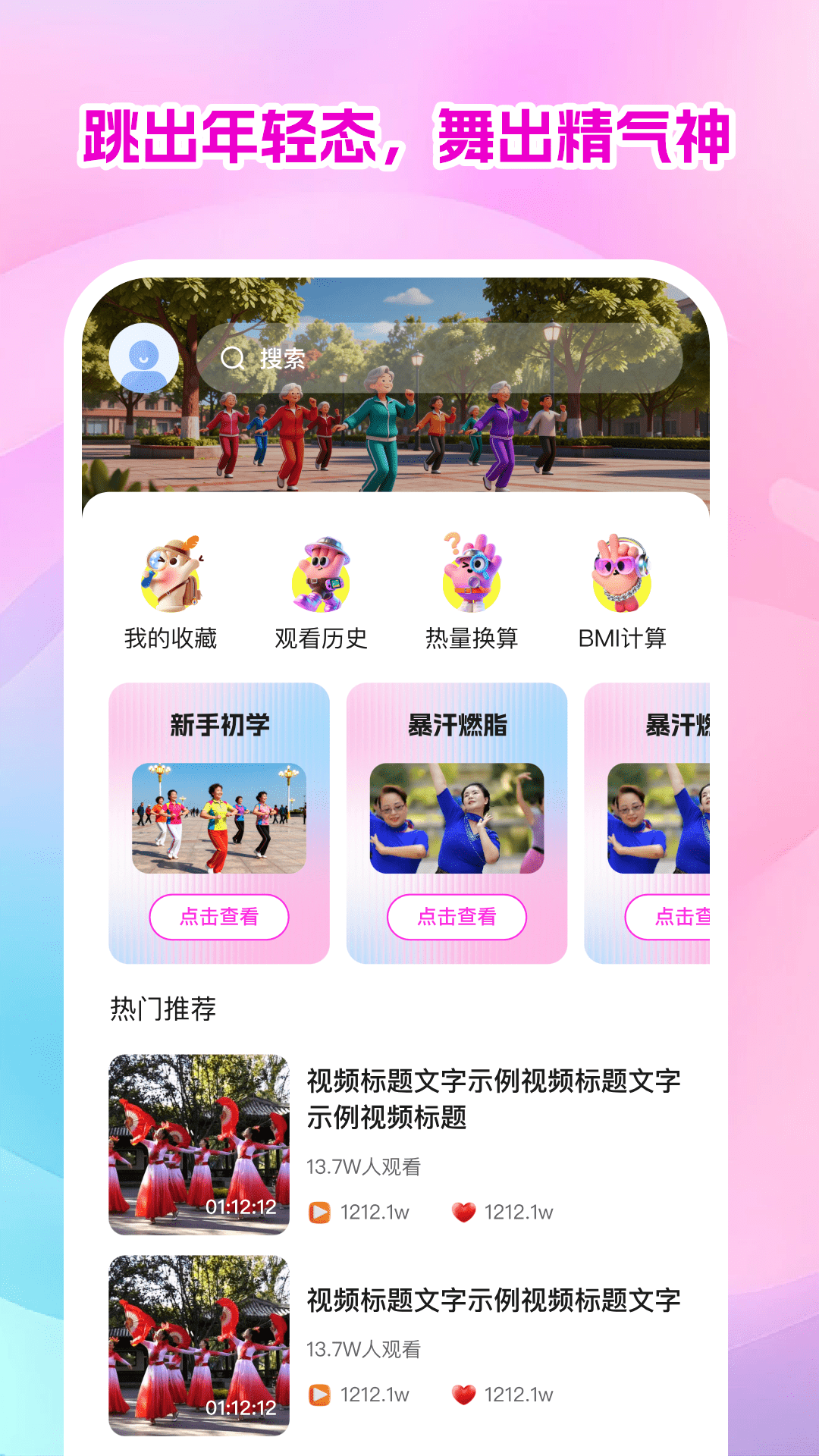 跳出年轻态,舞出精气神;这是一款专为中老年群体打造的一站式生活服务 APP,集广场舞学习、健康管理、美食指南于一体,用简单易用的设计,满足长辈们的日常娱乐与健康需求,让晚年生活更精彩、更健康。 核心广场舞板块,为不同水平用户打造全周期学习体系:新手专区提供零基础入门攻略,从节奏把控、动作记忆到手部练习,一步步拆解学习难点;热门专区汇聚海量爆款广场舞视频,按新手初学、暴汗燃脂等分类清晰呈现,支持收藏、历史记录,方便随时回看;更有专业广场舞指南,涵盖健康注意事项、场地礼仪等内容,让长辈们科学跳舞、文明健身,跳出年轻态,舞出精气神。 健康管理工具贴心实用,内置 BMI 计算器,输入身高体重即可一键测算体重状态,清晰标注偏瘦、正常、超重、肥胖区间,搭配专业计算公式与健康提示,帮长辈随时掌握身体状况;同时支持热量换算功能,科学管理运动与饮食,守护健康生活。 美食推荐板块,汇聚海量经典家常菜、特色菜品,每日更新美食推荐,从宫保虾球到水晶虾仁,丰富菜品搭配清晰展示,满足长辈们的下厨需求,轻松解锁美味食谱,丰富餐桌日常。 APP 界面设计简洁明亮,大字体、大图标、操作逻辑简单,长辈们无需学习就能轻松上手。从广场舞学习到健康管理,从美食烹饪到日常娱乐,全方位覆盖中老年群体的生活需求,是陪伴长辈们享受快乐晚年的贴心伙伴。